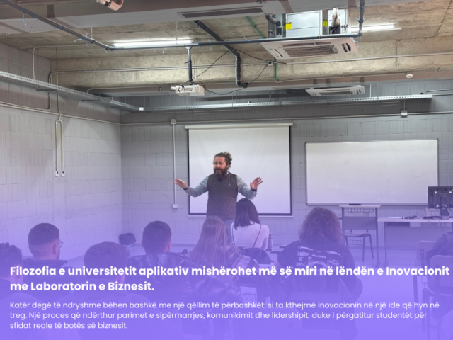 Filozofia e universitetit aplikativ mishërohet më së miri në lëndën e Inovacionit përmes Laboratorit të Biznesit, një hapësirë ku studentët zhvillojnë ide dhe i transformojnë ato në projekte konkrete me potencial për tregun.